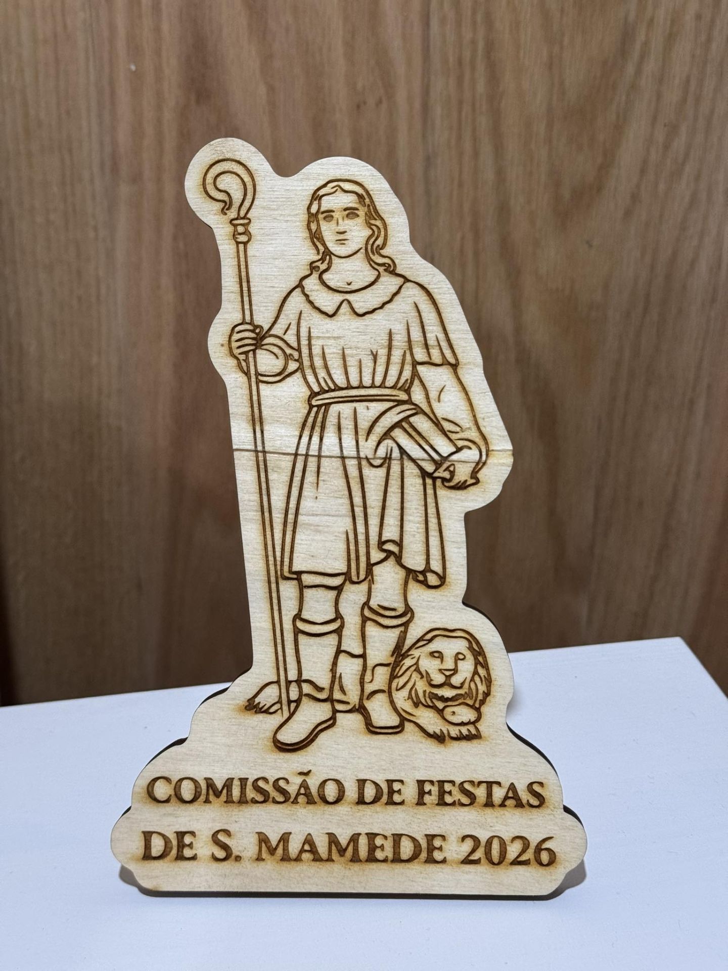 Também tem disponível para venda brindes de São Mamede: figuras em madeira gravada, porta-chaves e ímanes.